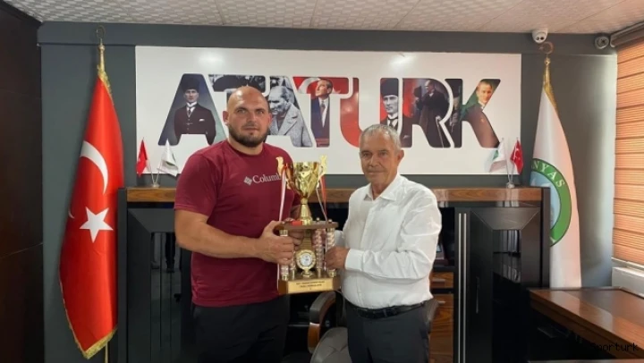 661. Tarihi Kırkpınar Yağlı Güreşleri Başpehlivanlık Yarı Final müsabakasında Başpehlivanlık Boyunda 3. olan Ertuğrul Dağdeviren, Manyas Belediye Başkanı Tancan Barçin'i makamında ziyaret etti.