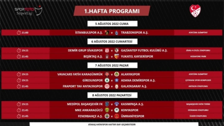 Bu değişikliklere bağlı olarak 5 Ağustos Cuma günü saat 19.15'te oynanacak olan İstanbulspor - Trabzonspor müsabakasının saati ise 21.00 olarak değiştirildi. Esenyurt Necmi Kadıoğlu Stadı'nda devam eden bakım onarım çalışmaları nedeniyle sezonun açılış müsabakası Atatürk Olimpiyat Stadı'nda oynanacak.