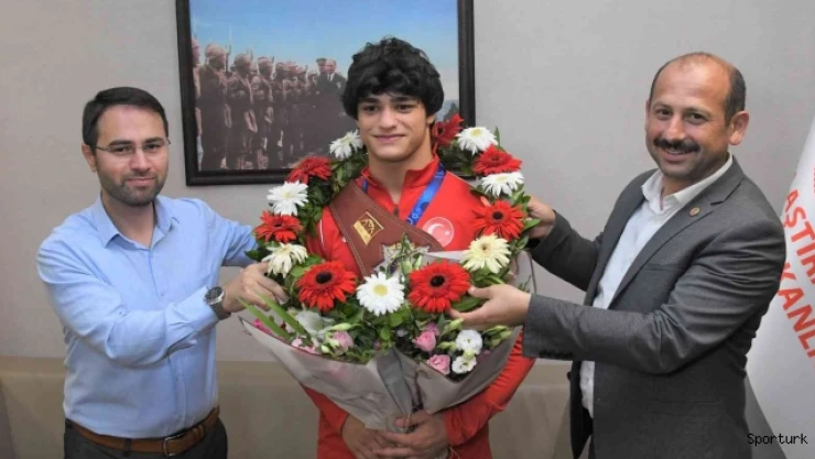 Dünya şampiyonu güreşçi çiçeklerle karşılandı