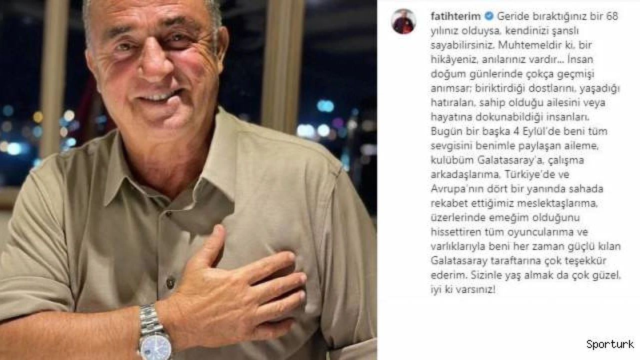 Galatasaray Teknik Direktörü Fatih Terim, sosyal medya hesabından yaptığı paylaşımda, "Geride bıraktığınız bir 68 yılınız olduysa, kendinizi şanslı sayabilirsiniz. Muhtemeldir ki, bir hikayeniz, anılarınız vardır. İnsan doğum günlerinde çokça geçmişi anımsar; biriktirdiği dostlarını, yaşadığı hatıraları, sahip olduğu ailesini veya hayatına dokunabildiği insanları. Bugün bir başka 4 Eylül'de beni tüm sevgisini benimle paylaşan aileme, kulübüm Galatasaray'a, çalışma arkadaşlarıma, Türkiye'de ve Avrupa'nın dört bir yanında sahada rekabet ettiğimiz meslektaşlarıma, üzerlerinde emeğim olduğunu hissettiren tüm oyuncularıma ve varlıklarıyla beni her zaman güçlü kılan Galatasaray taraftarına çok teşekkür ederim. Sizinle yaş almak da çok güzel, iyi ki varsınız!" ifadelerini kullandı.