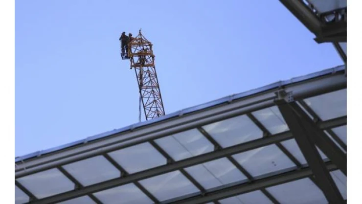 Süper Lig'in 31. haftasında Gençlerbirliği ile Fenerbahçe'yi karşı karşıya getiren mücadeleyi stadın yanındaki şantiyede çalışan işçiler vinç üzerinden izledi.