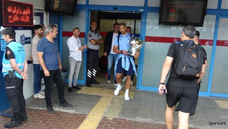 Trabzon Havalimanı'nda az sayıda taraftar tarafından karşılanan Trabzonspor kafilesi, Süper Kupa'yla birlikte kendilerini bekleyen takım otobüsüne binerek Mehmet Ali Yılmaz Tesisleri'ne hareket etti.
